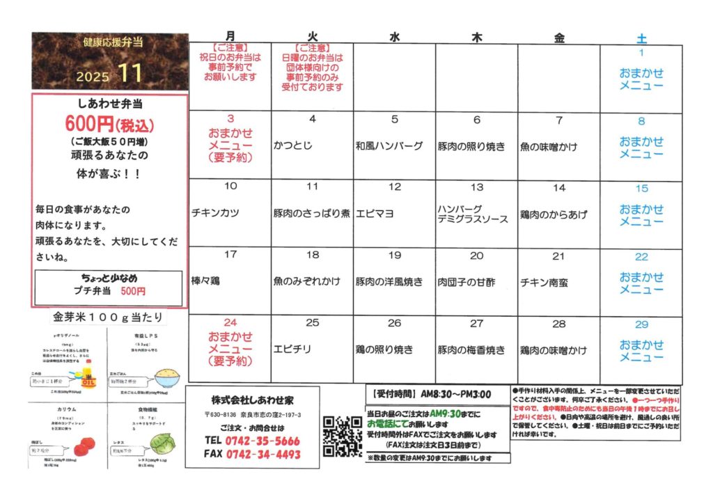 しあわせ家の日替わり弁当は、地元で採れた季節の野菜を中心に、栄養バランスにこだわったおかずとスタッフの笑顔でしあわせをお届けします。